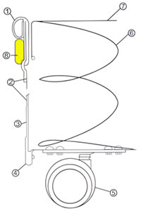 剖面圖二1、不銹鋼上口圈向外反折,加上特殊不銹鋼護圈,兩者以滾壓式固定之。2、HDFE耐沖擊塑料板3、HDFE耐沖擊塑料板桶下補強。4、底盤 5、腳輪 6、彈簧7、塑料高速托盤 8、塑料色環